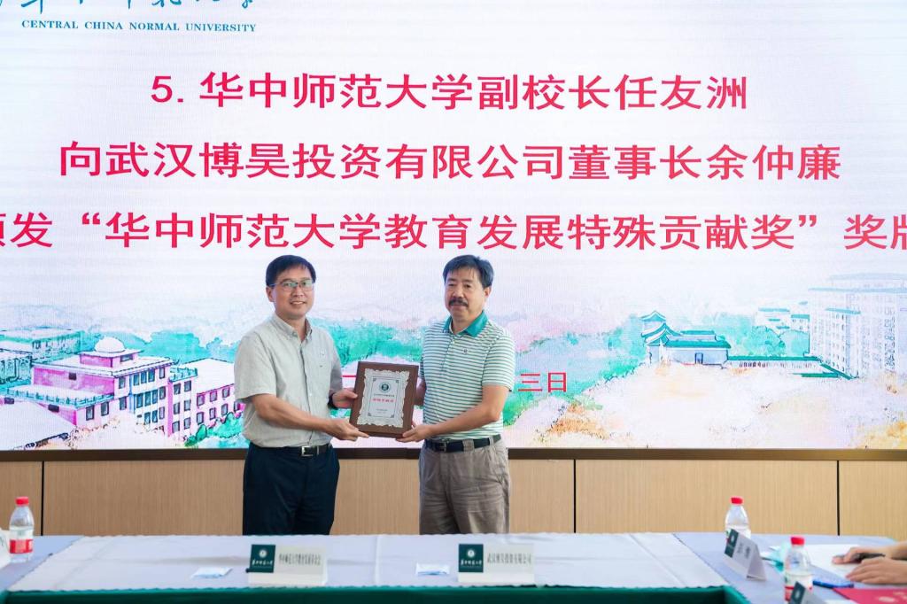武汉博昊投资有限公司董事长助理余卓丞、武汉云稼景筑设计工程有限公司董事长张岩、人民网湖北频道总编辑荣先明、湖北博昊济学基金会理事长助理谭琪以及学校党委宣传部、教育发展基金会、政治与国际关系学院等相关单位负责人及师生代表参加捐赠仪式。