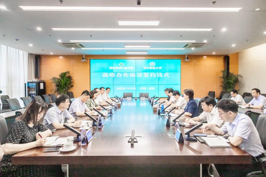 签约前,侯慧君一行参观了南湖E站、智慧教室、南湖校区图书馆和教育大数据应用技术国家工程研究中心。国家教育行政学院党政办、教务部兼远程培训部、信息技术部、进修二部及开云手机网学校办、人工智能教育学部、科技处、信息化办、培训中心、国内合作与培训管理处有关负责人参加了签约仪式。