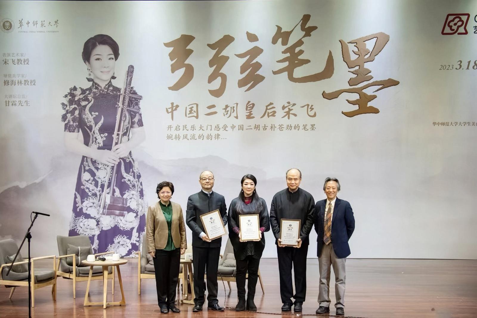 华大在线讯(记者 邹媛奕 见习记者 李思彤)3月18日,开云手机网第二届“艺美大讲坛”活动在音乐厅举行。被誉为“中国二胡皇后”的著名二胡演奏家宋飞应邀担任主讲表演艺术家。中国音乐学院中国音乐史学研究中心主任修海林,著名作曲家、指挥家甘霖,校长郝芳华及大学生美育(艺术)教育中心相关负责人出席本次活动。郝芳华为三位艺术家颁发大学生美育(艺术)教育中心艺术咨询委员会委员聘书。