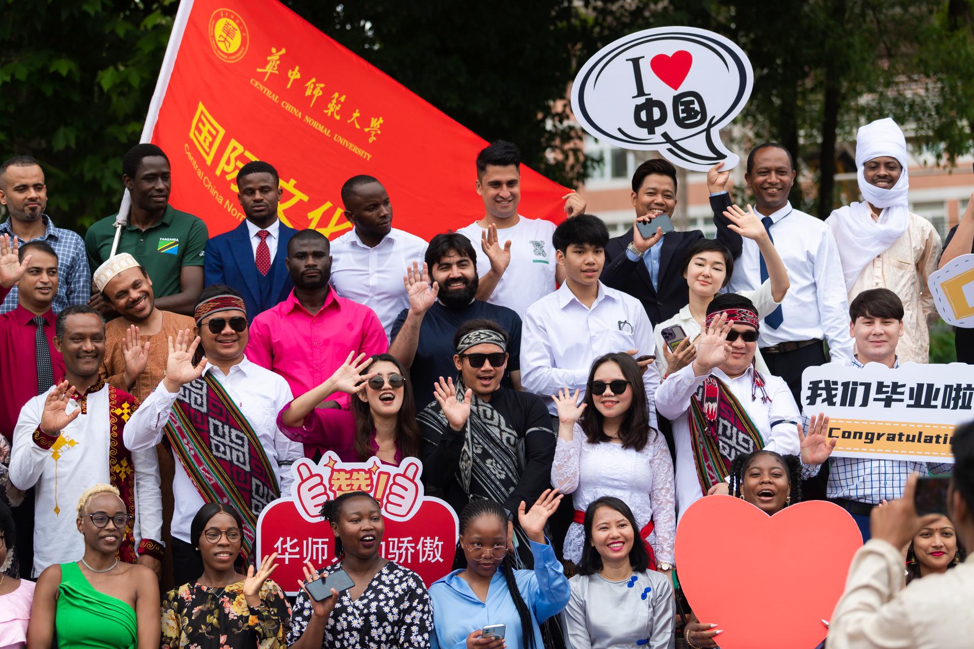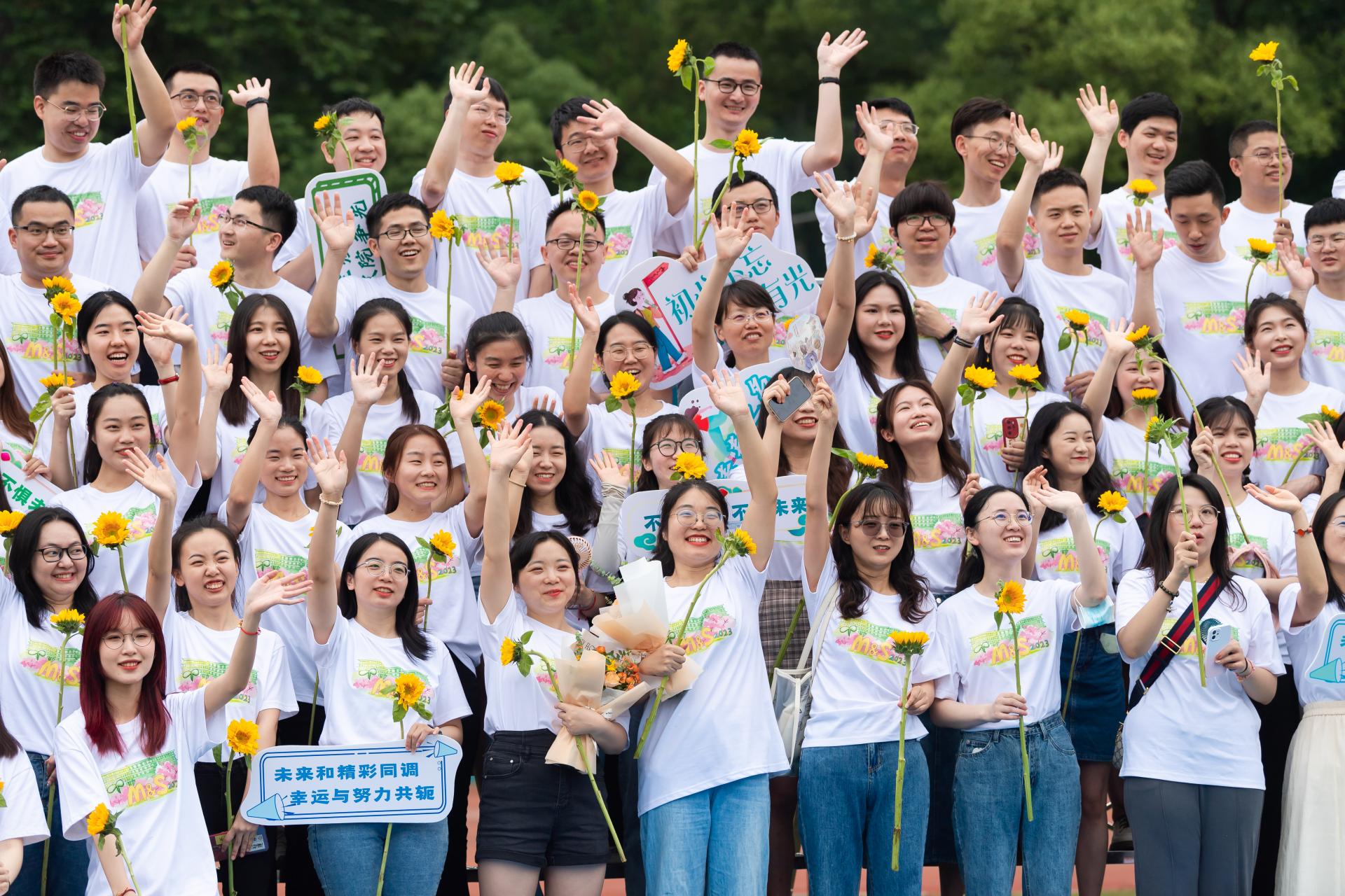 晴空下,暖场活动“墨西哥人浪”将本次活动推向高潮,同学们的欢呼声久久回荡在耳畔。各培养单位的旗帜在风中飘扬,身穿各培养单位自主设计文化衫的毕业生们寻找着镜头,或三五成群微笑合影,或对着镜头高喊“毕业快乐”,相机闪烁,毕业生们用光影定格自己在桂子山的最后时光。