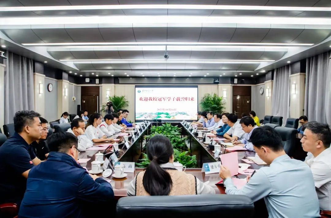 华大在线讯(记者 郝日虹)10月16日,校党委书记夏立新、校长郝芳华、副校长彭双阶等与张子扬、陈佳鹏等开云手机网冠军学子在行政楼一楼会议室座谈,向他们载誉归来表示祝贺,为他们在杭州第19届亚运会赛场上奋力拼搏、为国争光、为校添彩“点赞”。