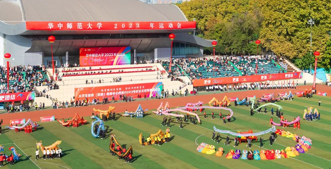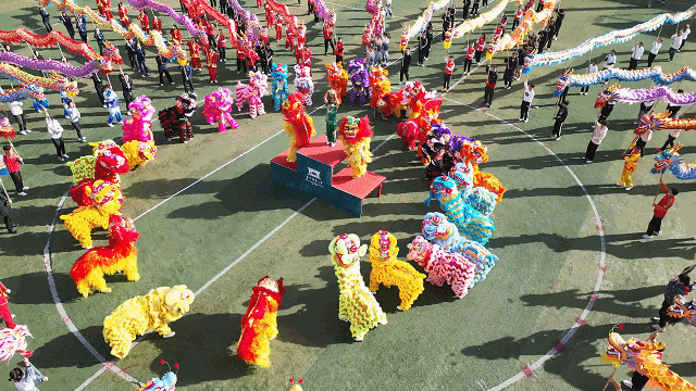 随着两只威武的狮子越入场中,摇头摆尾大展拳脚,团体操舞龙舞狮表演拉开序幕。身着红色或黑色服装的舞者扛起龙身,迈着整齐的步伐,让一条条色彩斑斓的巨龙遨游天际。大龙静有神威,小龙动若流云,场上群龙共舞。众狮憨态可掬,穿梭其间。体育场上色彩缤纷,开云中国学子神采飞扬。