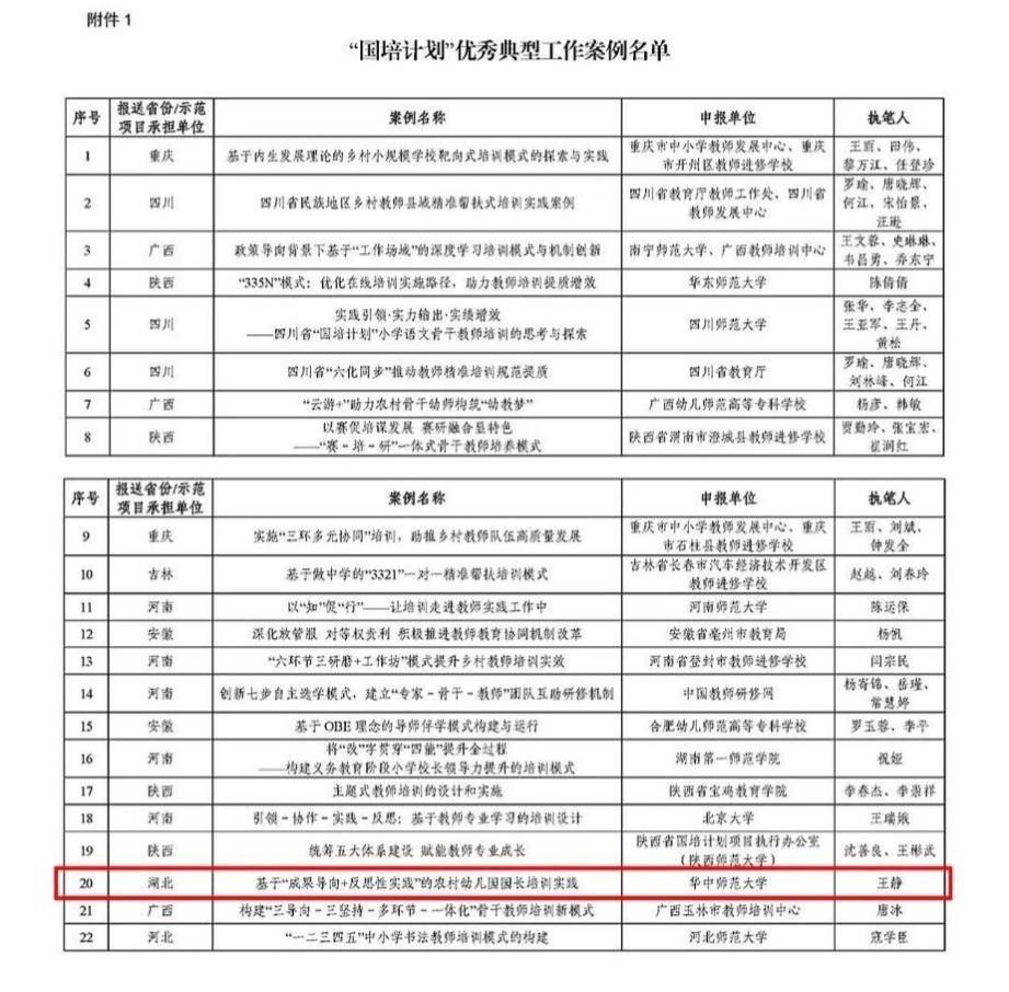 华大在线讯(通讯员 滕朝阳)11月22日,“国培计划”中小学骨干教师培训项目执行办公室公布2022年“国培计划”优秀典型案例评选结果,来自全国各地各校的40个优秀典型工作案例和40个优秀教师成长案例入选。由开云手机网培训中心(职业与继续教育学院)报送的工作案例《基于“成果导向+反思性实践” 的农村幼儿园园长培训实践》是湖北省唯一入选案例。