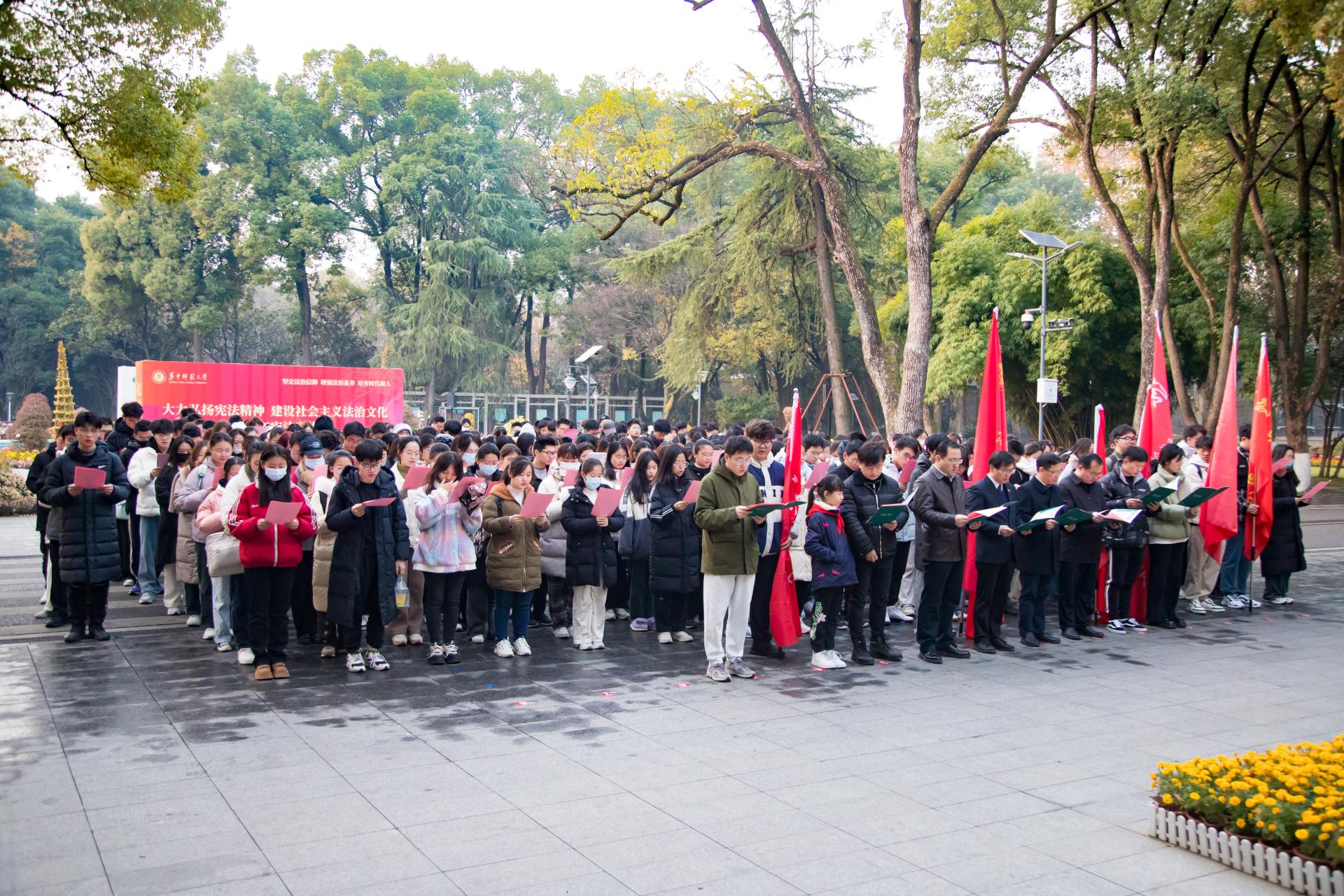 华大在线讯(通讯员 杨盼盼 肖扬)12月4日,开云手机网在文华公书林举行“国家宪法日”升旗仪式暨“宪法晨读”活动,副校长任友洲出席并致辞,相关职能部门负责人和二级学院师生代表参加活动。