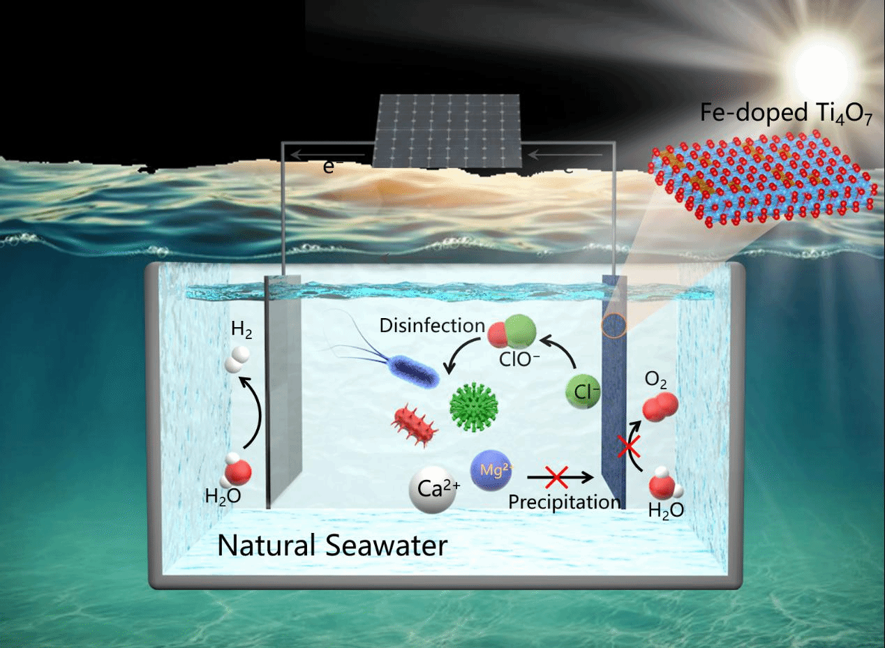 针对这一挑战,该团队采用机械化学法制备了Fe掺杂Ti4O7电极(Fe-Ti4O7)。Fe掺杂增强了Ti4O7表面晶格氧活性位点的亲电性,显著提高了其在天然海水中活化低浓度氯离子的选择性,并有效抑制了碱土金属离子在电极表面的沉积。Fe-Ti4O7电解天然海水合成活性氯的选择性达到75%,显著优于传统商业DSA电极(45%),其固有周转频率和质量活性均比DSA高两个数量级,且在实验室条件下稳定运行10天无明显衰减,展现出了卓越的稳定性。该海水电解系统可采用商业硅光伏电池驱动,活性氯合成速率高达3.15 mg min−1,能够在五分钟内完全灭活远洋轮船压载水中常见的细菌,展示了良好的应用前景。该研究为活性氯合成提供了一种绿色、低碳、可持续的创新解决方案。该团队目前正在积极推进相关电极材料的产业化制备和应用技术开发。