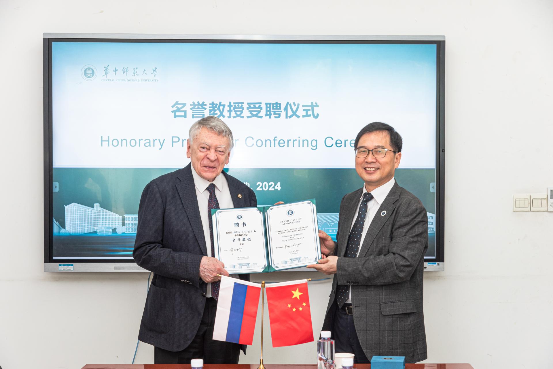 华大在线讯(通讯员 张芷珣)5月16日,俄罗斯技术大学主席亚历山大·西戈夫院士受聘仪式在9号楼举行。副校长任友洲为亚历山大·西戈夫院士颁发名誉教授证书。人事部、国际合作与交流处、物理科学与技术学院相关代表参加受聘仪式。