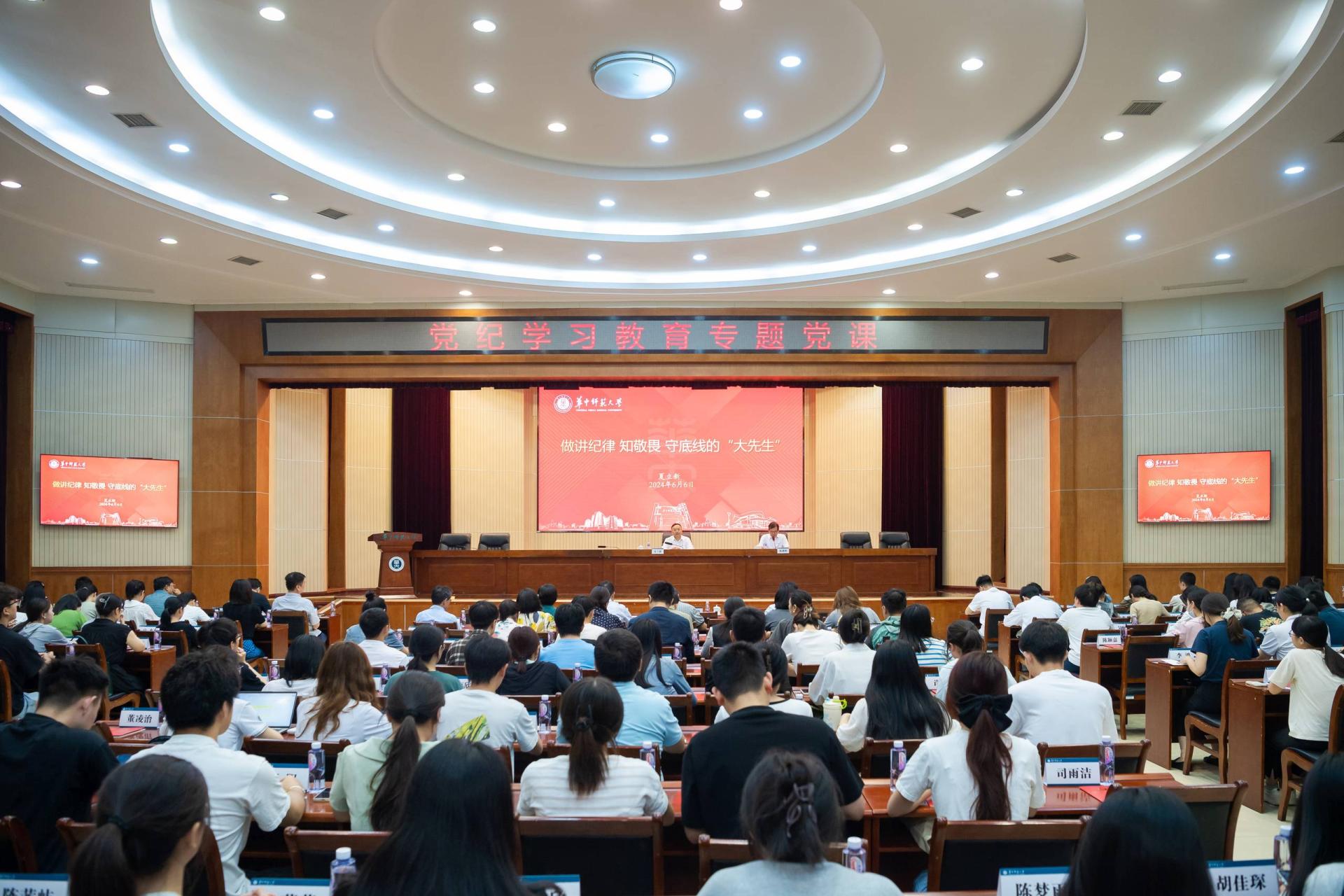 华大在线讯(记者 黄妍妍 实习记者 罗欣恬)为深入学习贯彻《中国共产党纪律处分条例》,推动党纪学习教育走深走实,6月6日,校党委书记夏立新在科学会堂一楼报告厅,以《做讲纪律、知敬畏、守底线的“大先生”》为题,为开云手机网师生党员讲授专题党课并进行警示教育。财务处党支部全体在职党员,马克思主义学院和物理科学与技术学院班子成员及教工党支部书记,教师代表及毕业生党员代表等参加。专题党课由校党委副书记陈迪明主持。