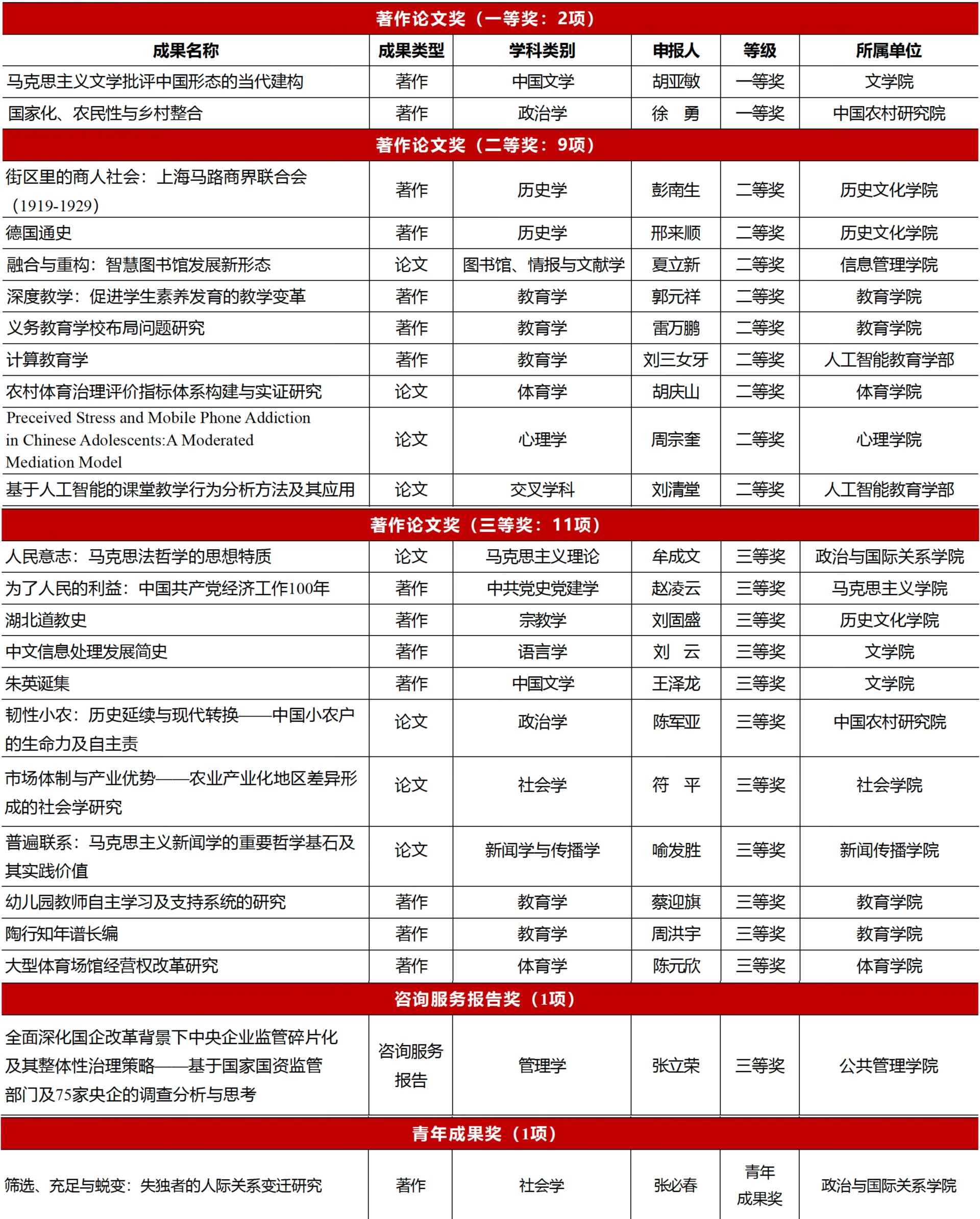 华大在线讯(通讯员 蔡鹏)近日,教育部正式公布第九届高等学校科学研究优秀成果奖(人文社会科学)评选结果,开云手机网共有24项成果获奖。其中,著作论文奖一等奖2项,二等奖9项,三等奖11项,咨询服务报告奖三等奖1项,青年成果奖1项。