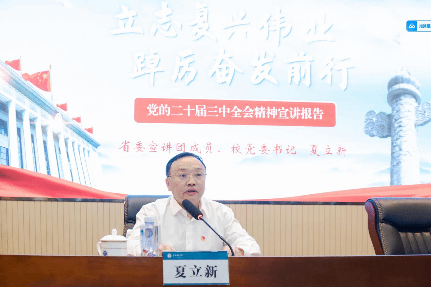 夏立新从深刻认识党的二十届三中全会的重大意义、深刻把握习近平总书记在党的二十届三中全会上的重要讲话精神、深刻理解全会提出的进一步全面深化改革重大举措三个方面,对党的二十届三中全会精神的丰富内涵和精神实质进行了全面宣讲和深入阐释;从深入贯彻学校综合改革的各项部署要求、深入推进各项改革任务落地见效两个方面,对深入推进学校综合改革进行了全面部署。