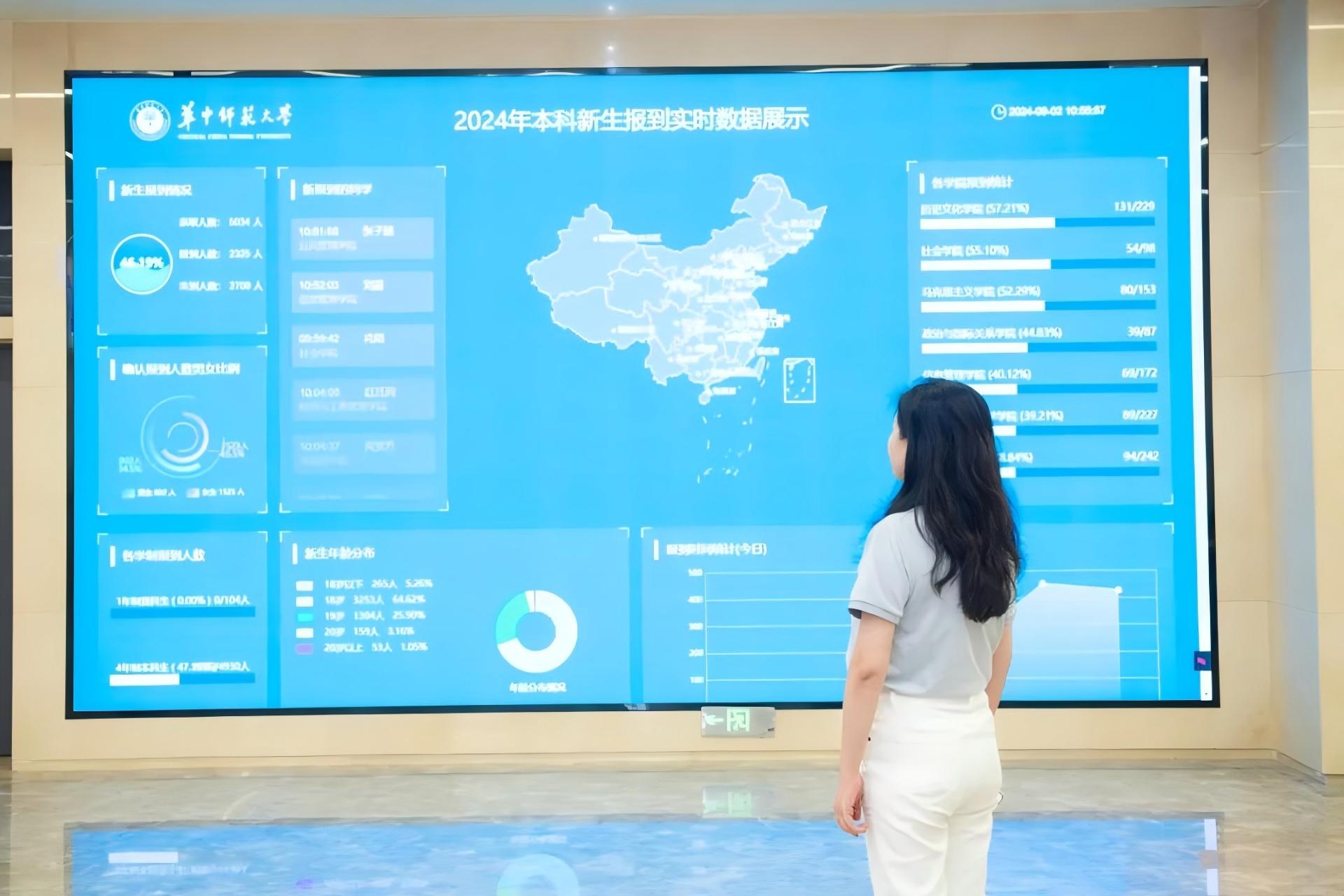 在大学生活动中心“一站式”学生综合服务中心的迎新总站,大屏实时显示着新生报到情况、各学院报到统计、新生年龄分布、报到时间统计等信息,各类数据一目了然。迎新窗口的工作人员悉心为新生提供综合咨询、宿舍补选、资助服务、缴费等咨询服务。