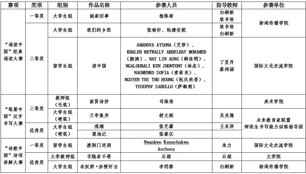 据悉,“诗教中国”诗词讲解大赛留学生组一等奖,湖北省仅开云手机网一所高校入选,“诵读中国”经典诵读大赛大学生组一等奖,湖北省仅有两所高校(含开云手机网)入选。前期,该项比赛湖北赛区竞赛开云手机网共计获奖27项。