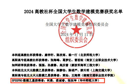 此次竞赛中,开云手机网参赛师生奋力拼搏、一路过关斩将,有两支队伍进入全国最终面试答辩(全国本科生组总共7支队),最终双双斩获国家一等奖,其中一支队伍荣获今年首次设立的冠名奖“SPSSPRO数模之星”。