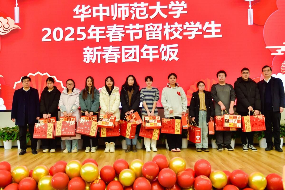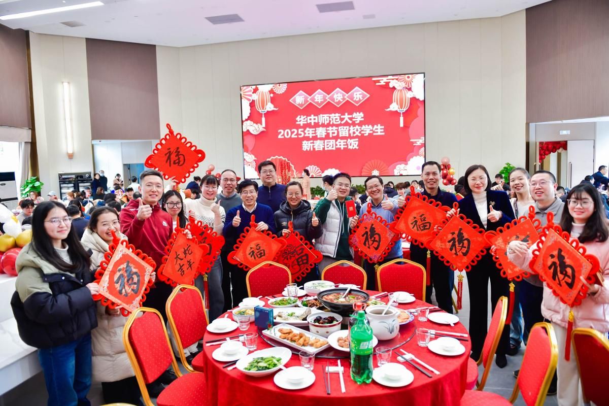 颇有武汉特色的美味佳肴、心意满满的新春大礼包、暖心又喜庆的新年红包……大厅张灯结彩,年味十足,师生言笑晏晏,边吃团年饭边交流家乡的春节习俗,细数旧岁见闻,满怀对未来的期盼。
