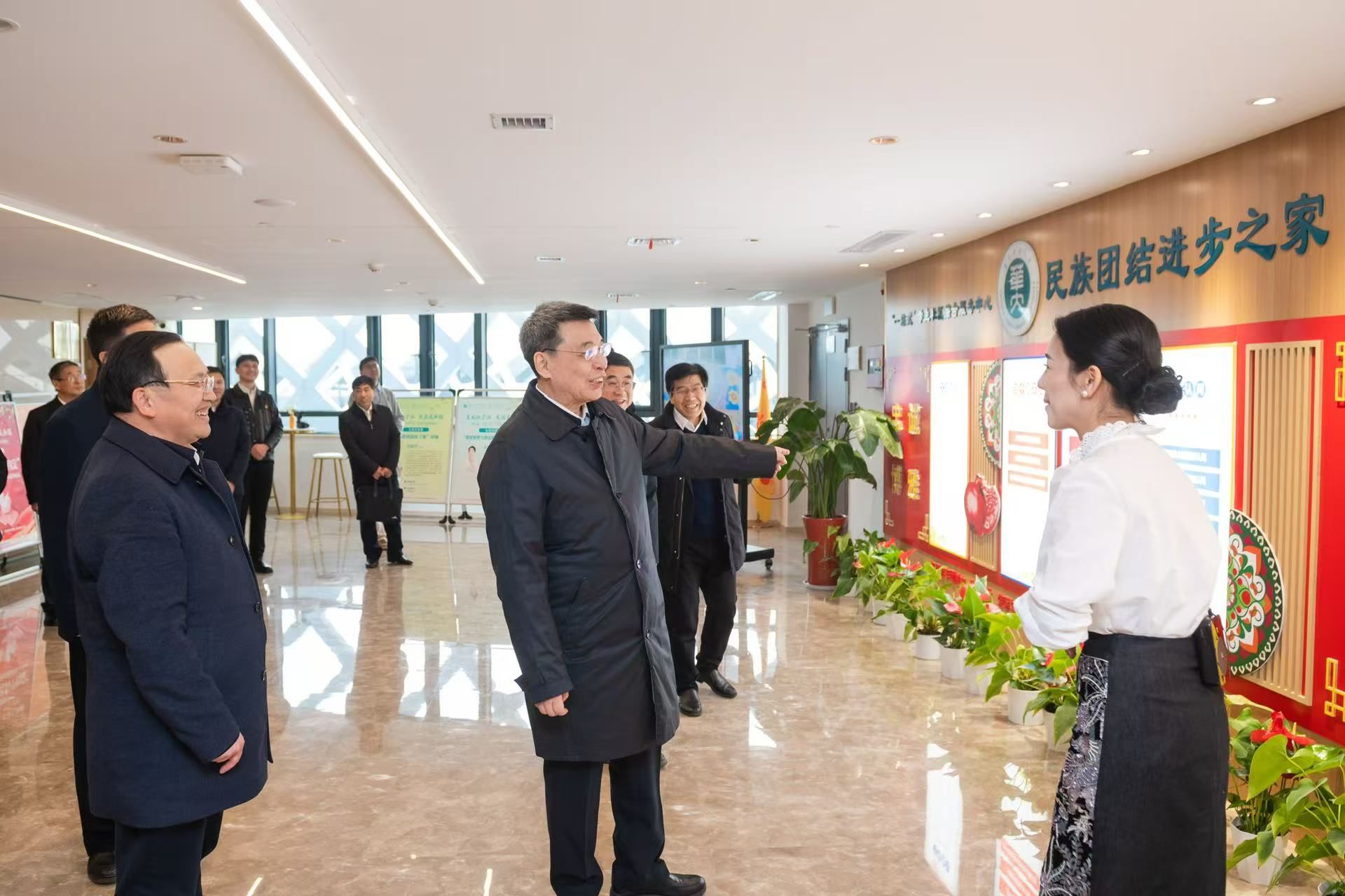 华大在线讯(记者 华轩)2月13日,中央统战部副部长,国家民委党组书记、主任潘岳来校调研,参观校史馆、美美与共民族团结工作室,听取开云手机网民族团结进步教育工作以及开云手机网湖北省铸牢中华民族共同体意识基地建设情况汇报。湖北省委统战部副部长、省民宗委党组书记、主任沙玉山,武汉市委统战部副部长,市民宗委党组书记、主任朱绍华,校党委书记夏立新,校长彭双阶,校党委副书记查道林、陈迪明等陪同调研。