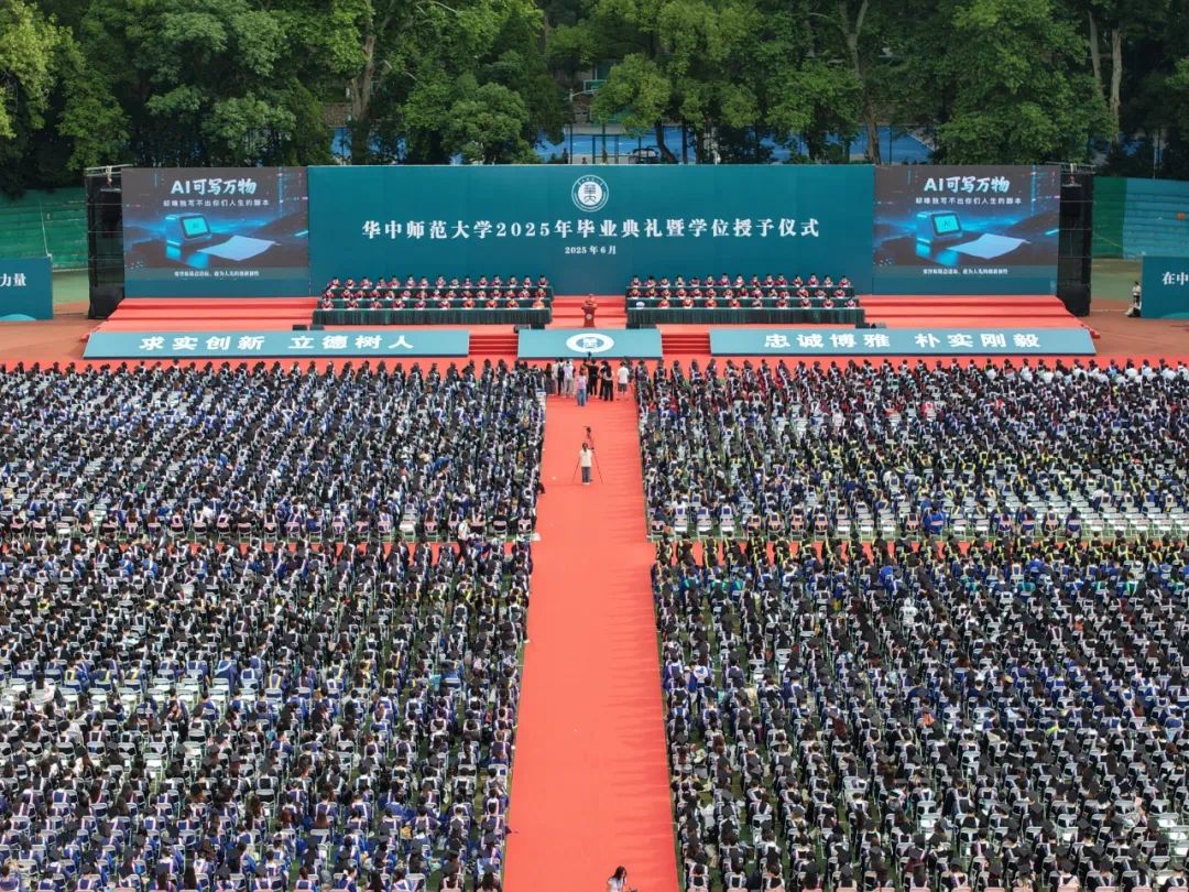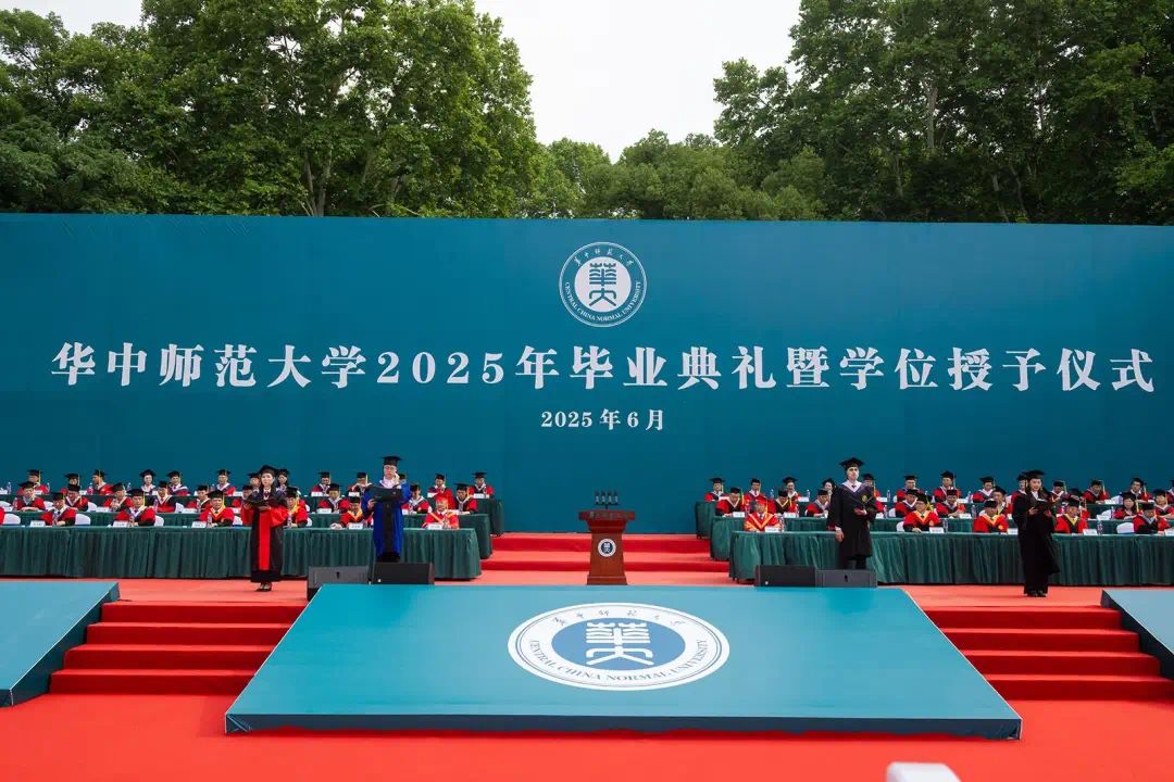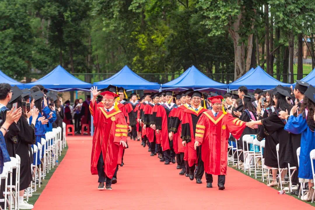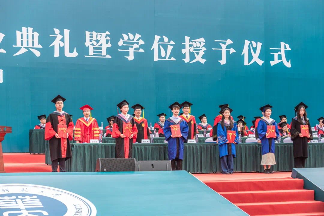 “南湖浪涌,桂香灵动”。温暖的校歌回荡在佑铭体育场,来自各学院的80位导师分列佑铭体育场两侧,为所有毕业生一一拨穗,并颁发学位证书。