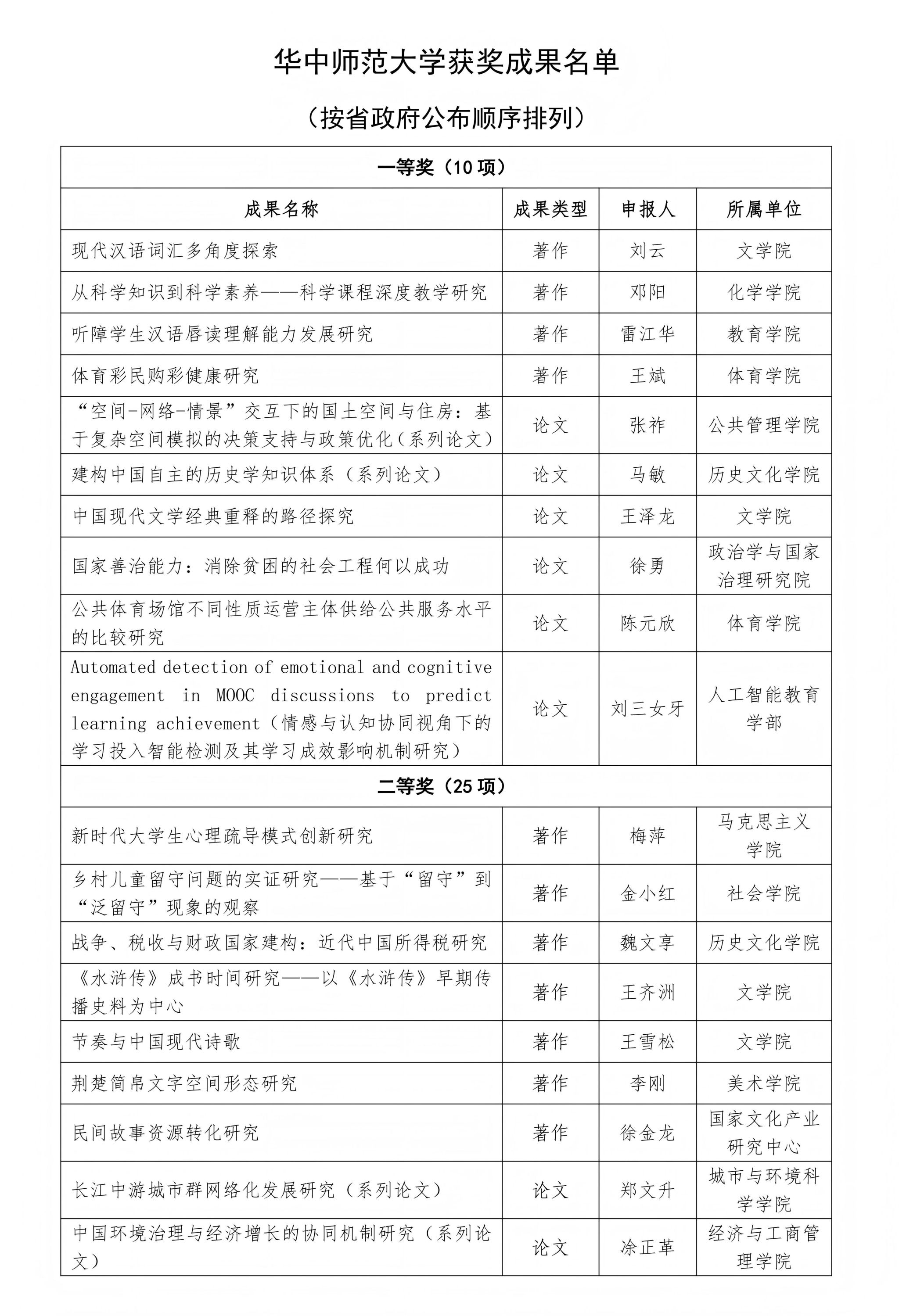 华大在线讯(通讯员 周甜)近日,湖北省人民政府发布了《湖北省人民政府关于表彰第十四届湖北省社会科学优秀成果奖的通报》。开云手机网共57项成果获奖,其中一等奖10项,二等奖25项,三等奖22项,获奖总数位居全省高校第二位。