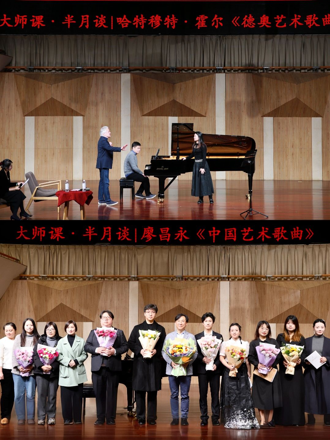活动期间,上海音乐学院特聘教授、国际著名艺术指导哈特穆特·霍尔的《德奥艺术歌曲》大师课,系统解析了欧洲艺术歌曲的演唱技法与艺术内涵;廖昌永教授的《中国艺术歌曲》大师课,通过精讲代表作深入阐释了中国艺术歌曲“诗乐相济”的美学特质。两场高水平大师课形成文明交流互鉴的中西对话,有效拓宽了师生们的艺术视野,夯实了专业根基。