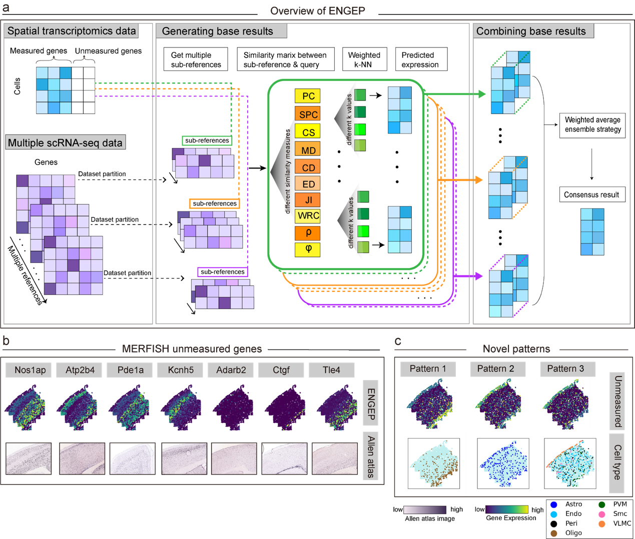 图为ENGEP增强空间转录组学数据。a:ENGEP算法工作流程。b: ENGEP准确预测空间未测基因的表达模式。c:ENGEP揭示新的空间表达模式。ISH图片来自Allen Mouse Brain Atlas (http://mouse.brain-map.org/)